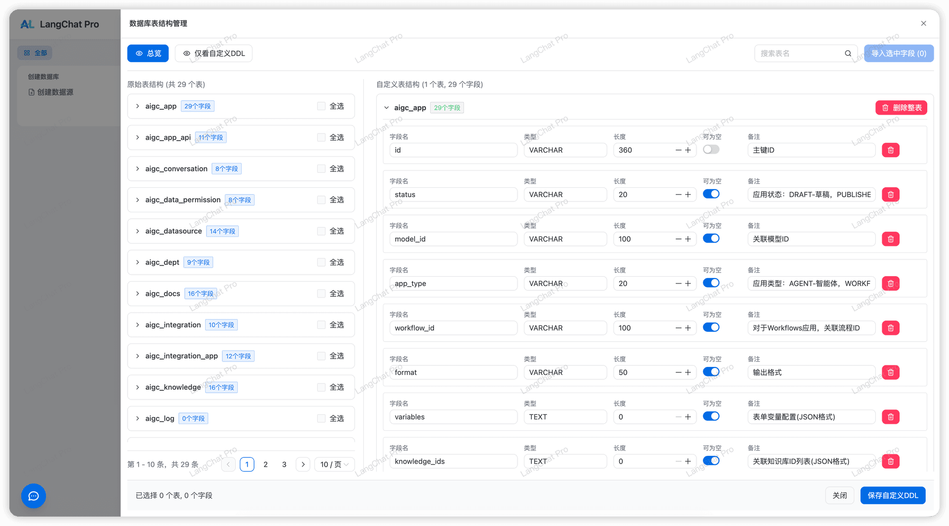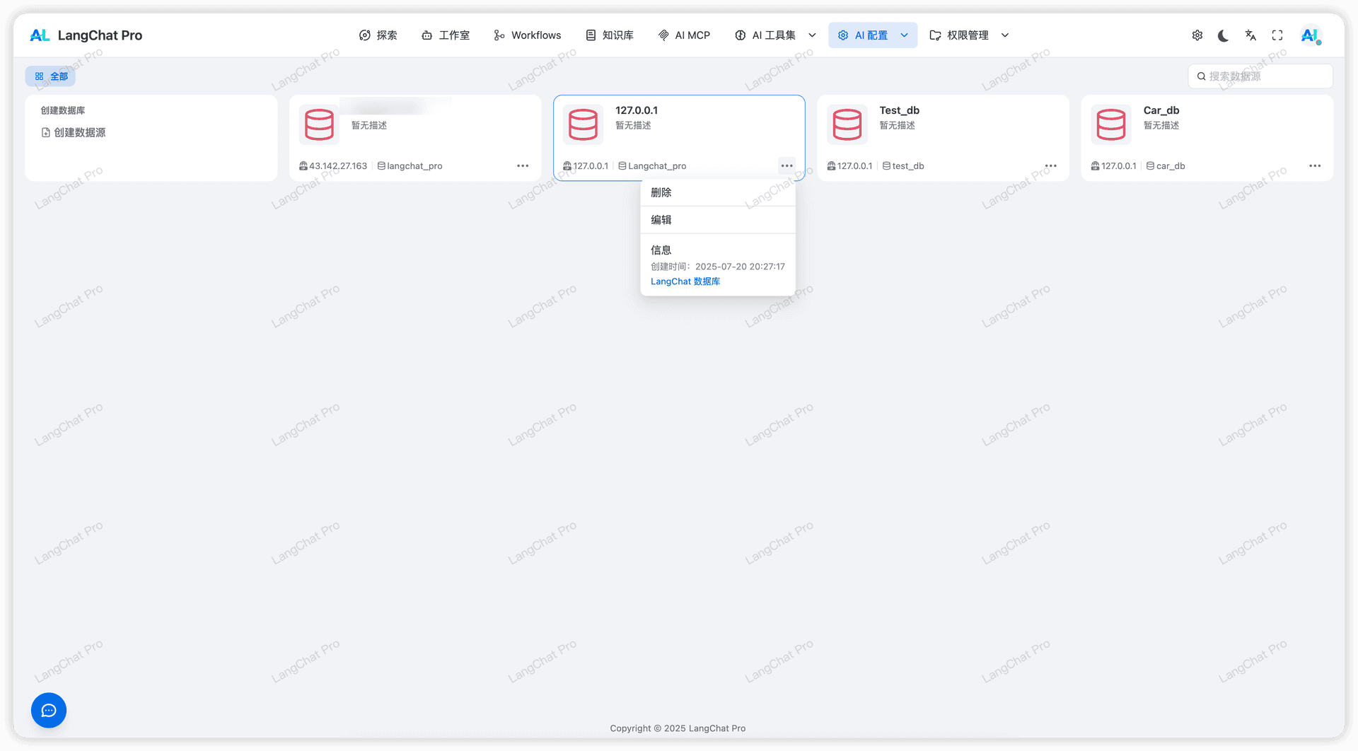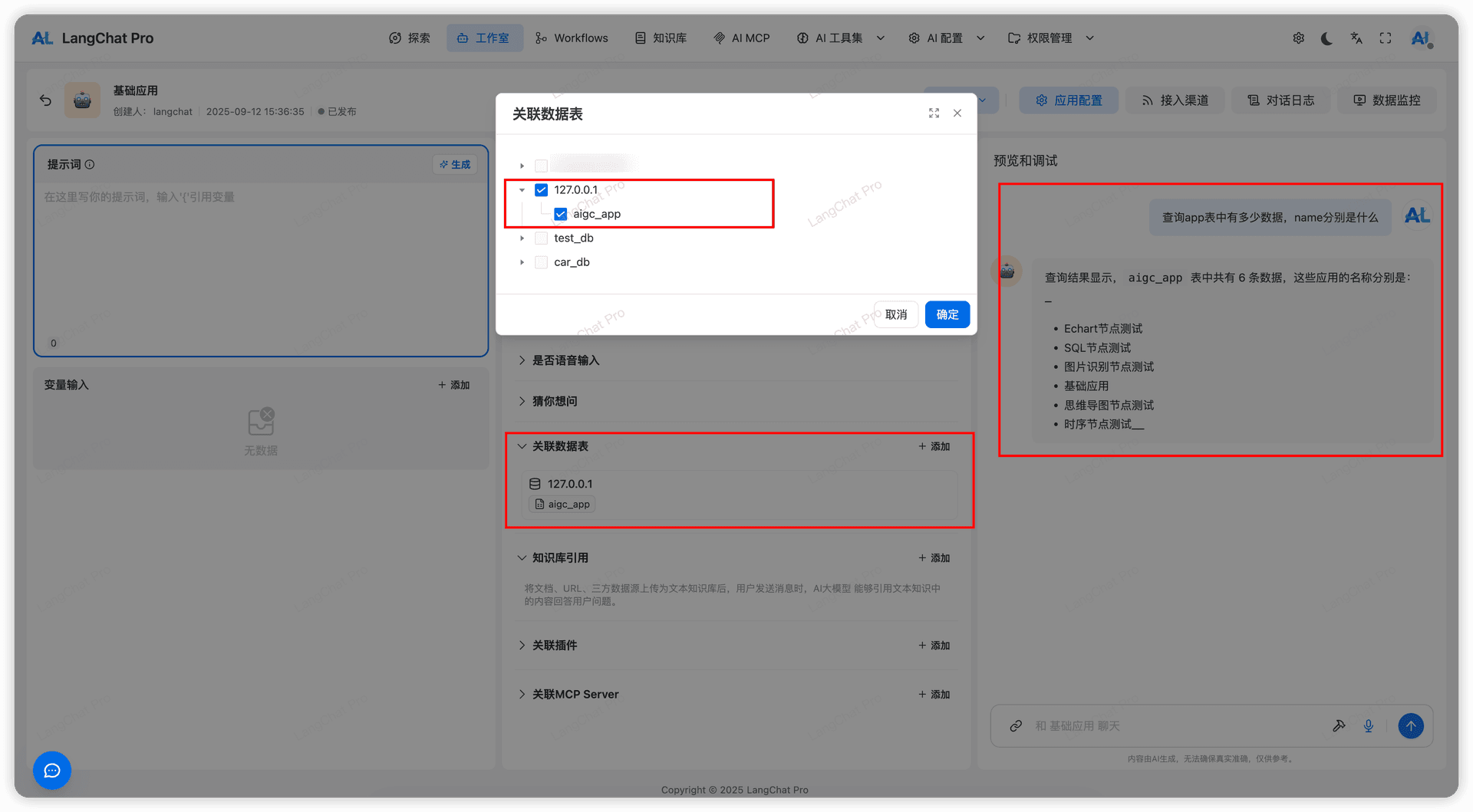 在 AI 工作流中直接执行 SQL 往往潜伏着巨大的安全风险(如数据注入、误删关键表等)。LangChat Pro 引入了内建的严格白名单拦截机制:
