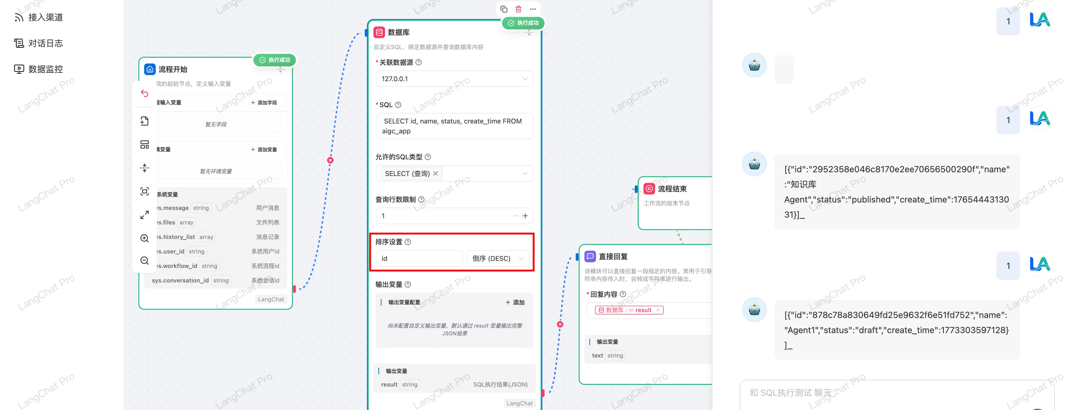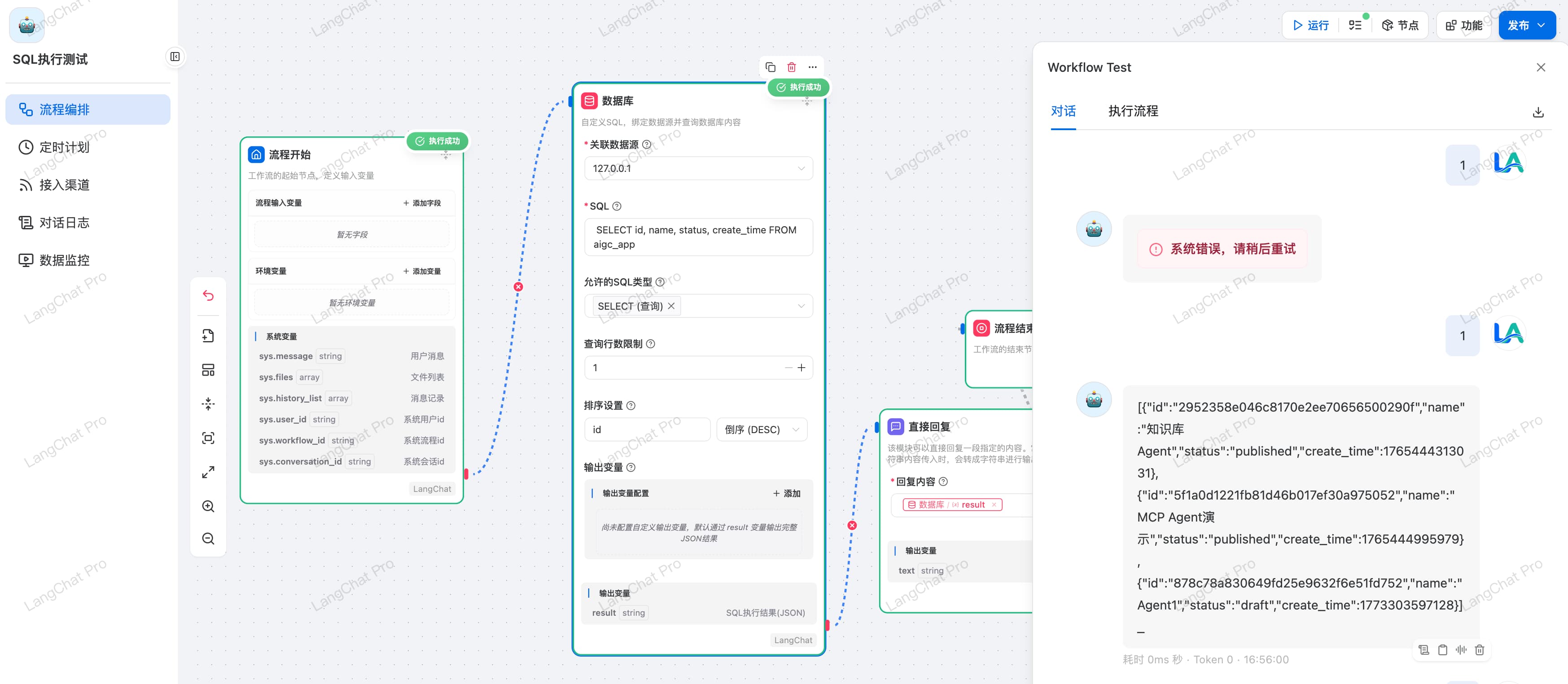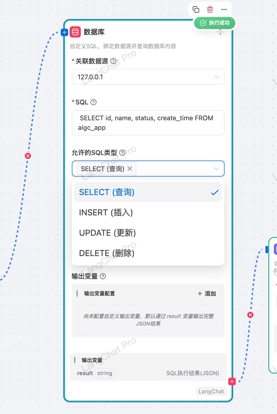 在 AI 工作流中直接执行 SQL 往往潜伏着巨大的安全风险(如数据注入、误删关键表等)。LangChat Pro 引入了内建的严格白名单拦截机制: