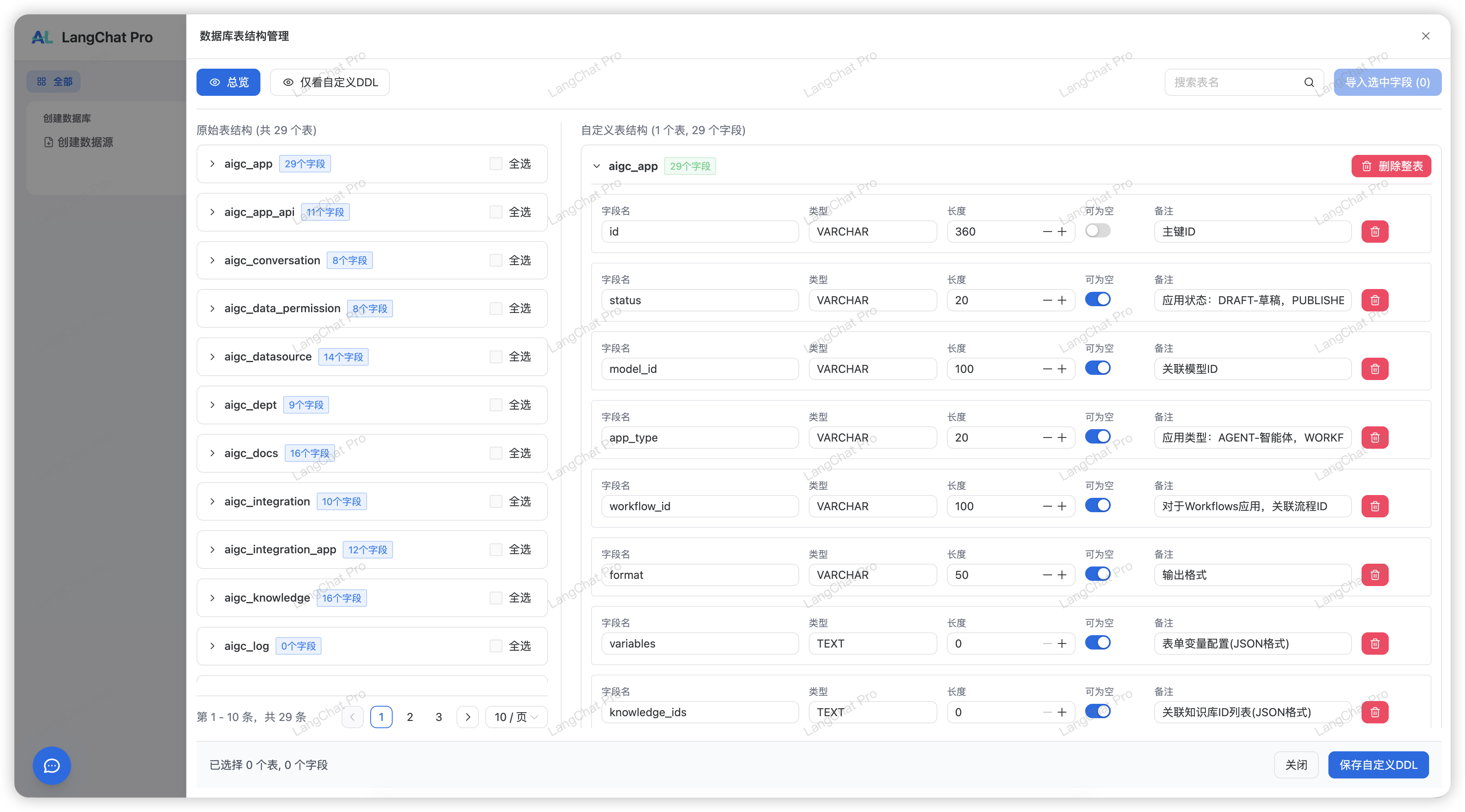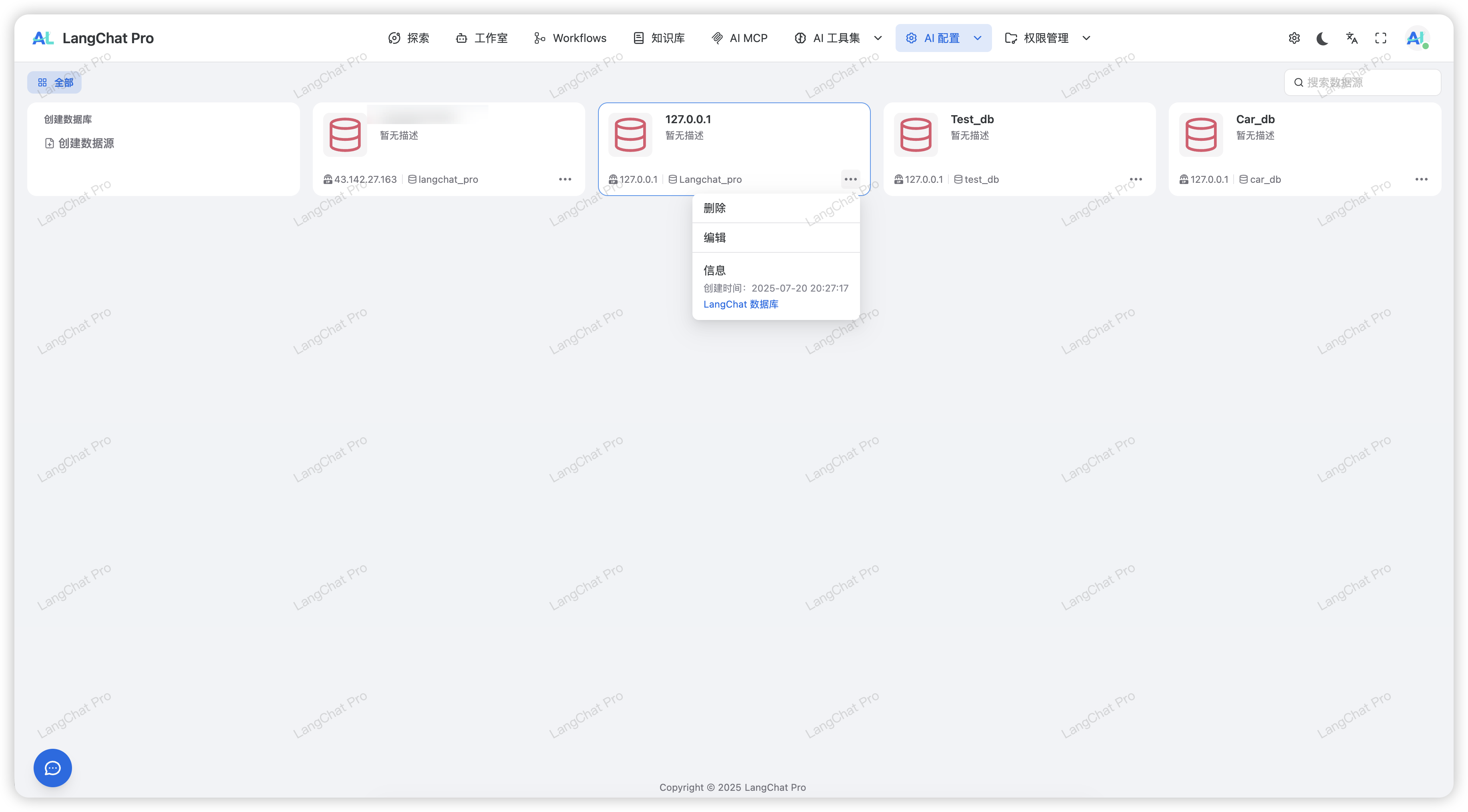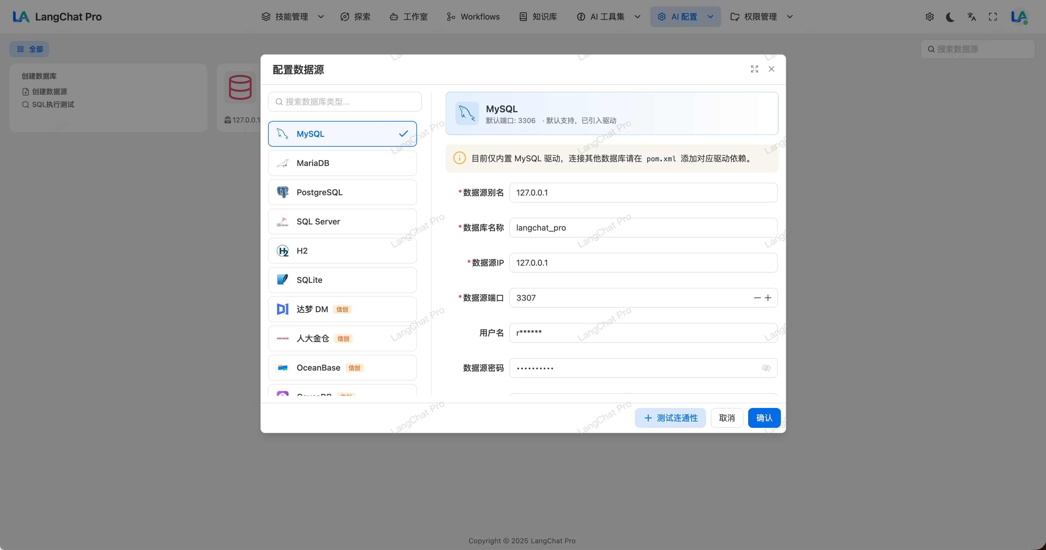 在 AI 工作流中直接执行 SQL 往往潜伏着巨大的安全风险(如数据注入、误删关键表等)。LangChat Pro 引入了内建的严格白名单拦截机制: