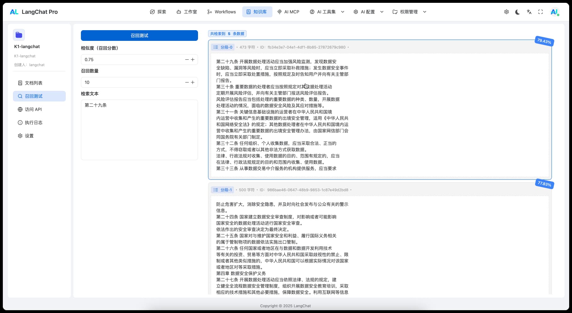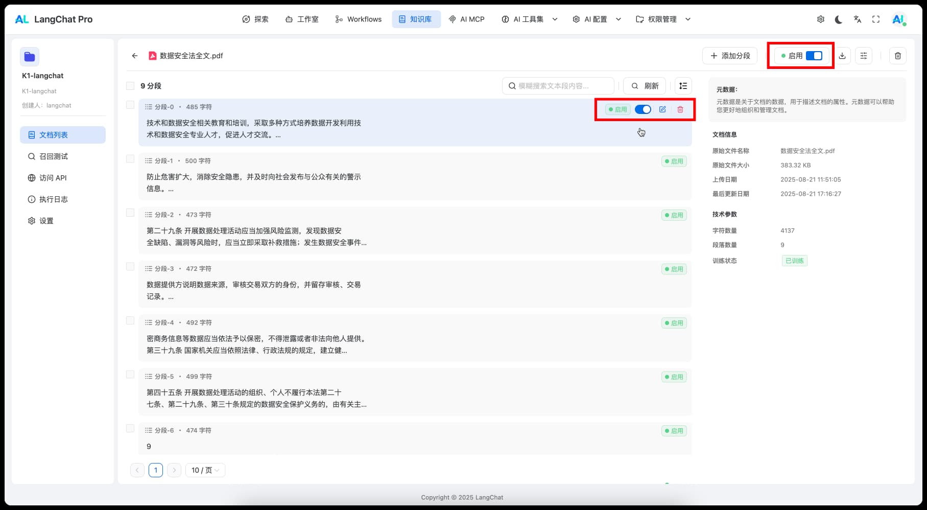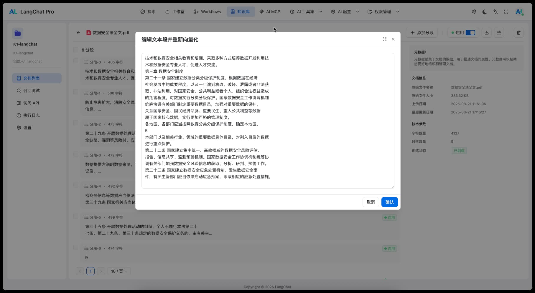 - 多算法分段机制 (Chunking):提供基于 NLP 深度语义句法拆分、Markdown AST 标签拆解、正则表达式或定长滑窗等丰富的文本碎片管理模式,可在前端实时验证拆解效果并手工修正 Chunk 片段。