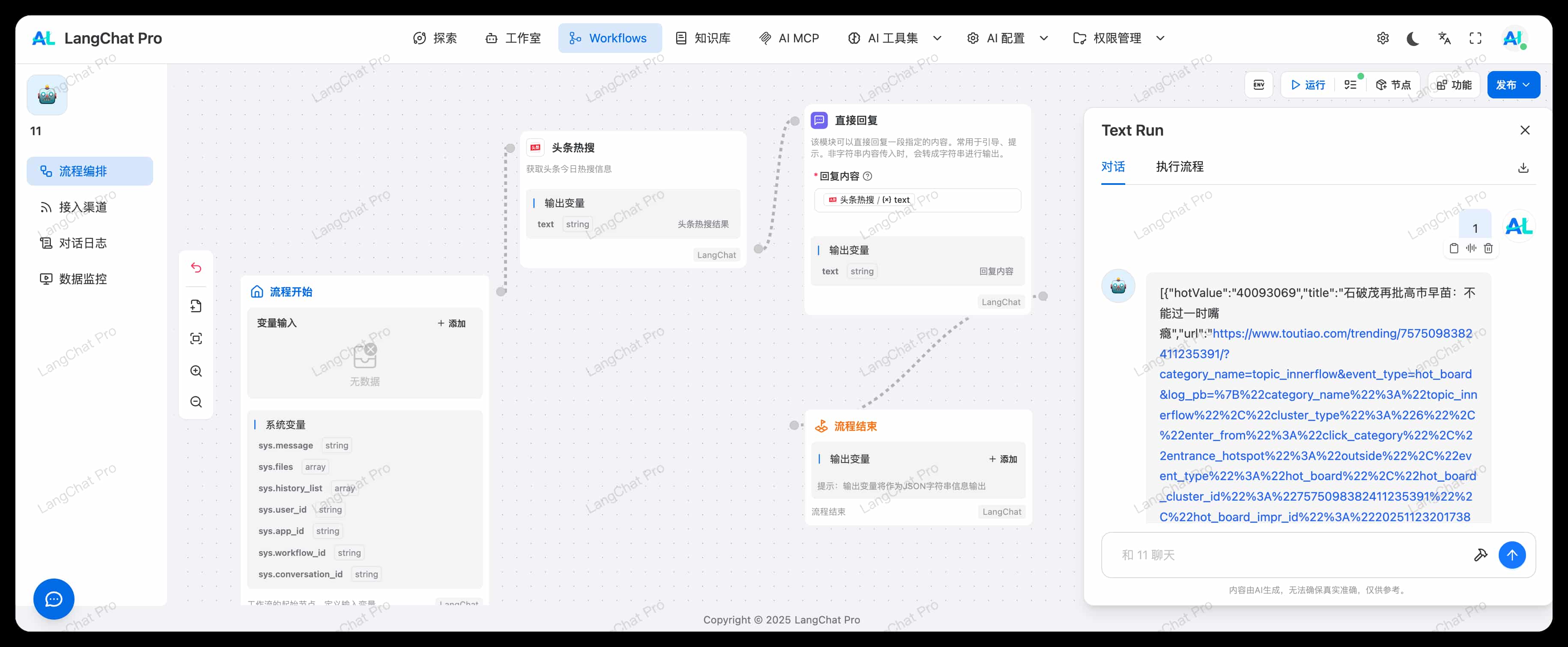 - 可视化画布:基于定制化 VueFlow 面板,一目了然实现节点间的线状数据依赖、全局上下文参数流动以及执行步骤追溯 (Tracing) 面板。