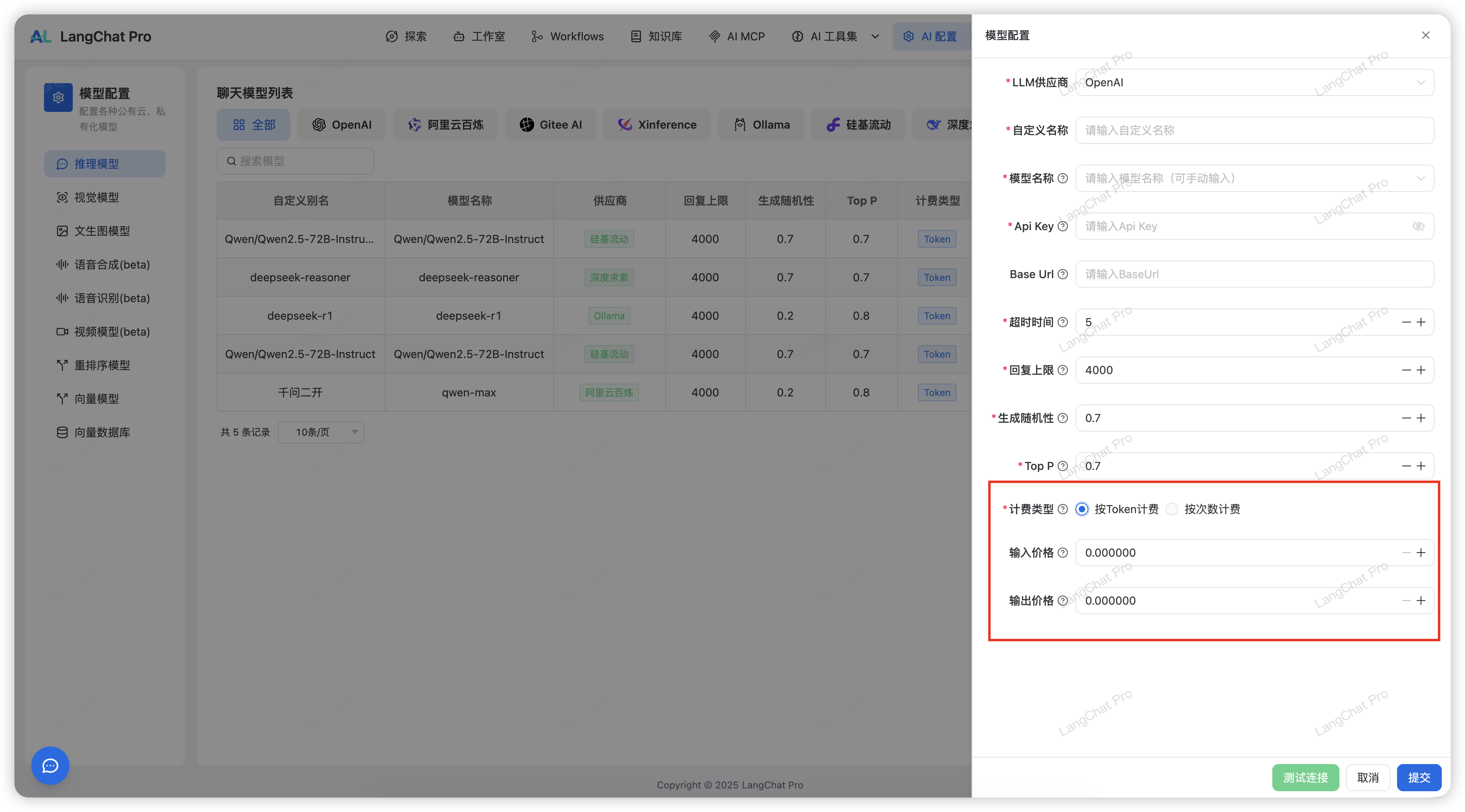 - 国内核心大模型生态:全面集成 深度求索 (DeepSeek-R1/Coder)、阿里百炼 (Qwen 全系)、百度千帆 (ERNIE-Bot)、智谱清言 (GLM-4)、字节豆包及硅基流动等。