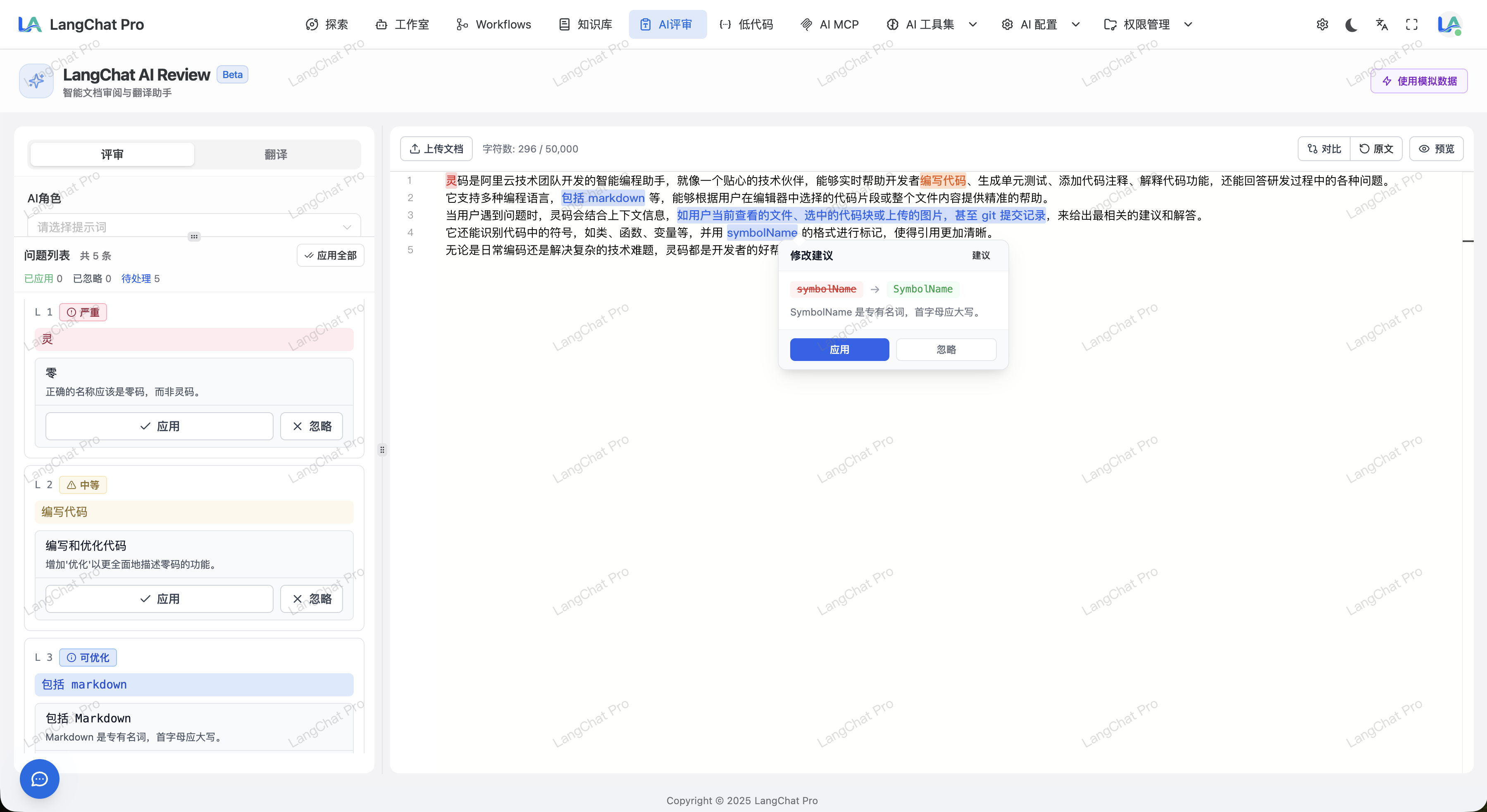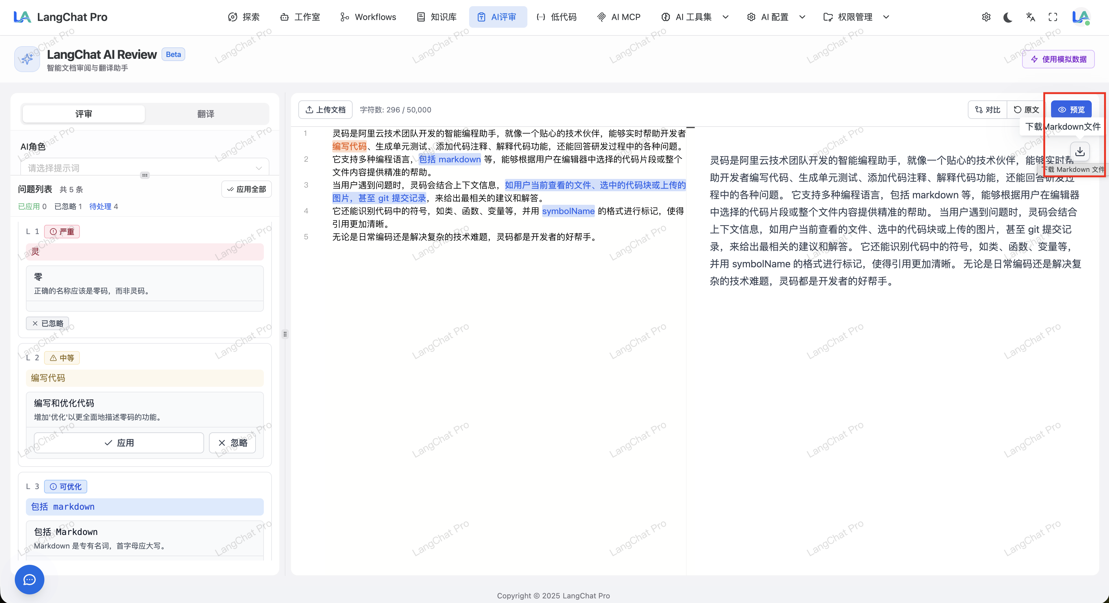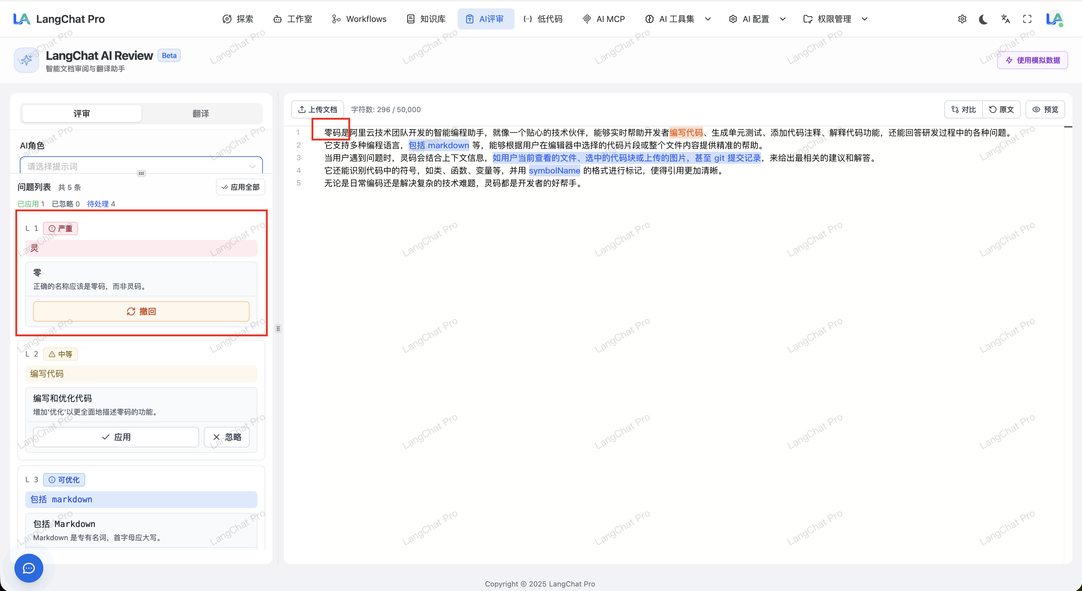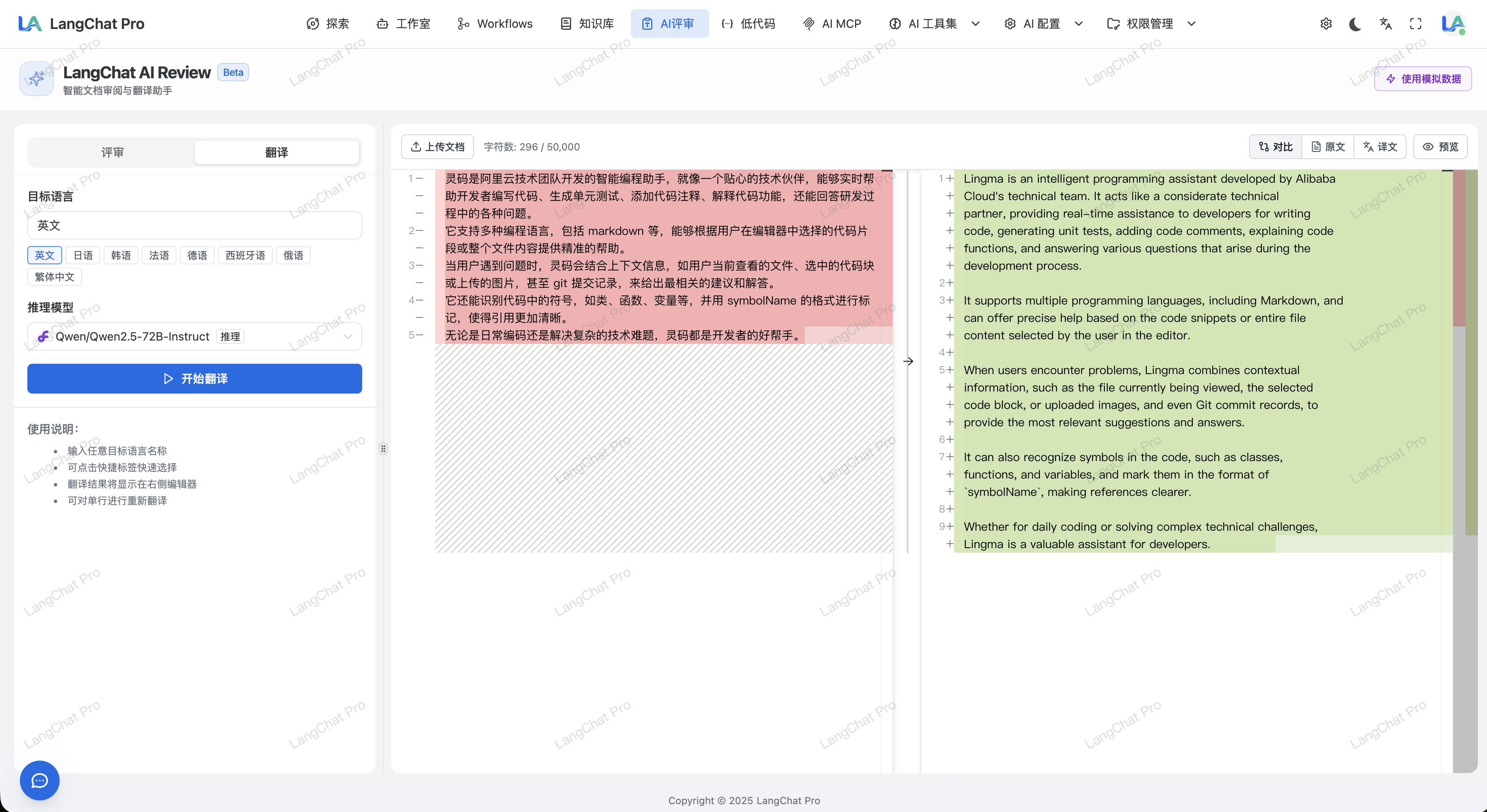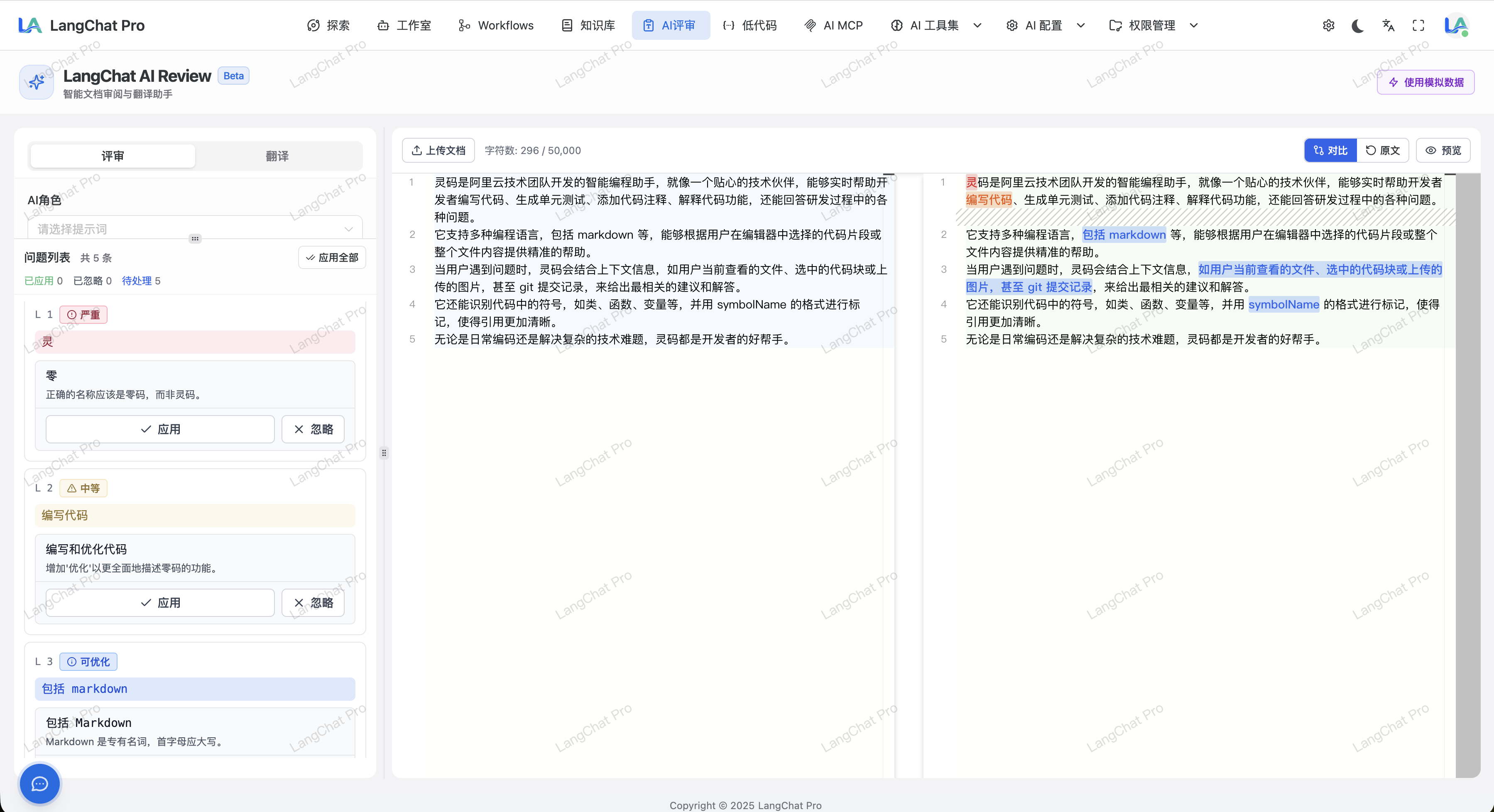 - 伴读式合规审批标注及互译视图:实时通过大模型探针在浏览器终端完成高亮修正指令与行内规范警告提示推送;内置全语种平行对比式长文润笔和语言翻译对照审定模块。